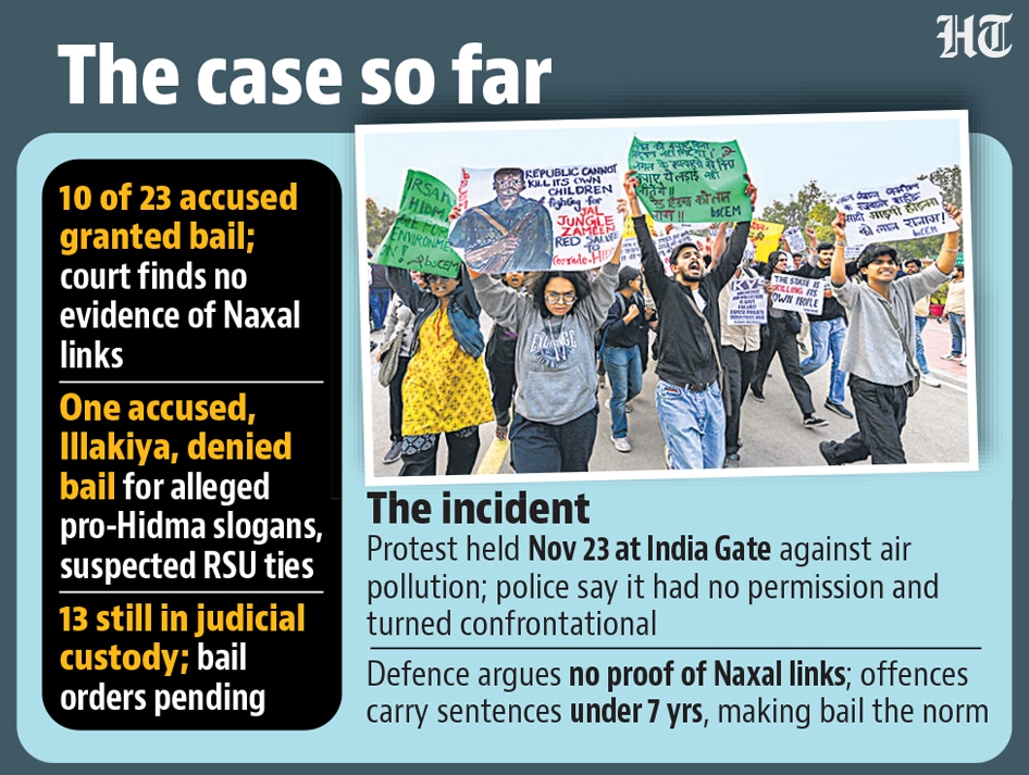 दिल्ली की एक अदालत ने पिछले महीने इंडिया गेट पर वायु प्रदूषण के खिलाफ विरोध प्रदर्शन के दौरान पुलिस के साथ हाथापाई करने और नक्सल समर्थक नारे लगाने के आरोपी 23 लोगों में से 10 को मंगलवार को जमानत दे दी, जबकि एक आरोपी की जमानत याचिका खारिज कर दी, जिसने कथित तौर पर उस स्थल पर एक नक्सली नेता के समर्थन में नारे लगाए थे।